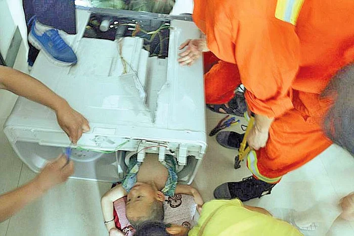 Micuţul Peng se afla în baie, blocat de la brâu în jos în maşina de spălat. Speriaţi, părinţii au chemat imediat pompierii, după ce s-au chinuit în zadar 30 de minute să-l elibereze. Echipa de salvare a fost nevoită să taie învelişul de tablă al maşinii de spălat şi s-o dezmembreze bucată cu bucată.