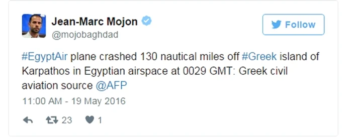 UPDATE 10:36 Ministerul egiptean al Aviației Civile a precizat că este mult prea devreme să se concluzioneze că avionul s-a prăbușit. Au trecut 7 ore de la dispariția zborului MS804. Compania EgyptAir a protestat pe rețelele de socializare împotriva dezinformării făcută de anumite publicații și canale de știri, care au început să lanseze tot felul de ipoteze cu privire la dispariția avionului. Însă, jurnalistul AFP Jean-Marc Mojon citează o sursă elenă care susține că avionul s-ar fi prăbușit la 130 de mile de insula Karpathos din Grecia.