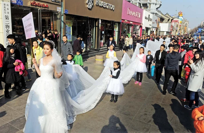 Trena acesteia are 100 de metri lungime şi a durat trei luni ca să fie confecţionată. 21 de croitori au trudit să o lucreze, cu scopul de a face reclamă unui magazin de rochii de nuntă din oraşul Jinan, provincia Shandong. Toţi locuitorii din urbe au ieşit ca să ajute mireasa să-şi care trena. Recent, ea s-a plimbat agale pe străzile oraşului, uimind pe toată lumea. Trena era într-adevăr foarte lungă, însă nici măcar nu se apropia de lungimea celei care este înscrisă în Cartea Recordurilor. Recordul aparţine tot unui designer chinez, din Xiamen, provincia Fujian, care a realizat o rochie de mireasă cu o trenă de nu mai puţin de 2.516 metri lungime.