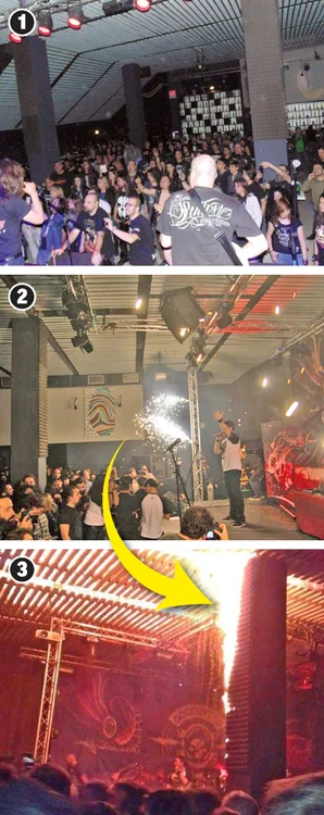 Un foc banal de artificii a provocat o tragedie greu de imaginat. O parte din spectactorii care au scăpat cu viață au postat pe Internet fotografii cu momentele-cheie al unei seri care începuse cu veselie și muzică bună (foto 1). Totul a pornit de la artificiile aprinse în partea dreaptă a scenei (foto 2). La câteva secunde, s-a aprins un stâlp izolat cu burete (foto 3). În câteva minute, tot tavanul de lemn al clubului era o vâlvătaie. Era începutul coșmarului.