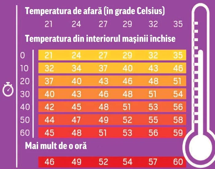 Temperatura de afară creşte semnificativ şi ajunge la aproape 60˚C în numai o oră. Respiraţia ţi se taie de îndată ce ai deschis portiera, trupul îţi arde pe dinăuntru ca-ntr-un cuptor şi începi să te deshidratezi. Au existat cazuri în care persoanele care au staţionat într-o maşină încinsă la soare au fost transportate de urgenţă la spital sau chiar au murit.