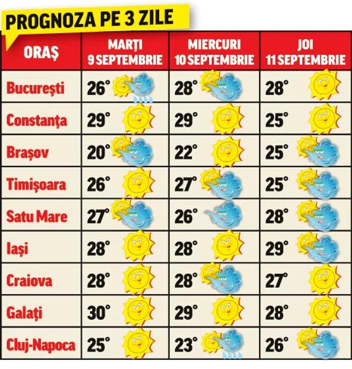 Va fi vreme frumoasă toată săptămâna, spun meteorologii ANM. Temperaturile vor fi mai mari cu până la 4 °C decât ar fi firesc la această dată. Până vineri, 12 septembrie, la orele prânzului se vor înregistra până la 26 -30 de grade în aproape toată ţara şi doar la munte vor fi 14 -18 grade. Din 12 septembrie, va intra în ţara noastră un val de aer umed care vor aduce câteva ploi slabe, mai întâi în vestul şi centrul ţării, apoi şi în sud şi est. Sunt posibile ploi mai importante în perioada 12 -14 septembrie. O dată cu precipitaţiile, temperaturile vor coborî cu câteva grade.