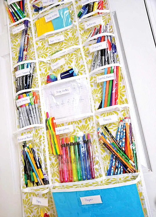 Pentru că nu se ştie niciodată când rămâne în pană de rechizite, nu ar strica să faci provizii. Le poţi pune într-o folie cu buzunare transparente, agăţată de uşa unui şifonier.