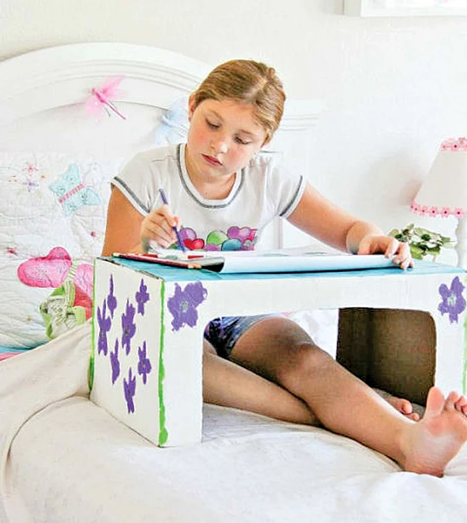 Temele – o plăcere, dacă le face cocoţat în pat, la măsuţa unicat pe care aţi făcut-o împreună, dintr-o cutie de carton mai rezistent.
