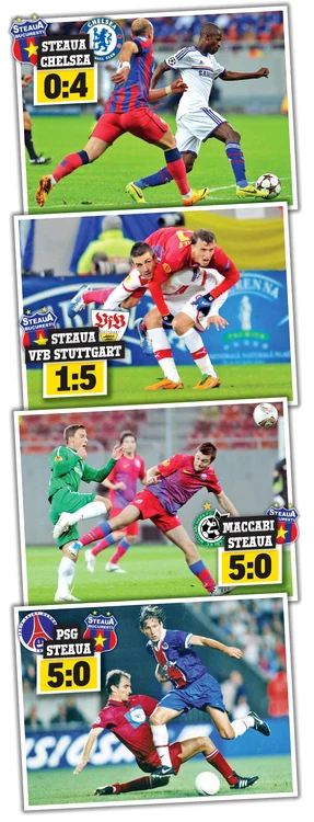 - Steaua – Chelsea, 0-4. S-a întâmplat în grupele Ligii Campionilor, sezonul 2013-2014, an în care românii i-au întâlnit pe englezi de patru ori. În primăvara lui 2013 s-au jucat optimile Ligii Europa, cu Steaua câştigând cu 1-0 la Bucureşti şi pierzând cu 3-1 la Londra. În toamnă lucrurile au fost însă mult mai complicate, iar Chelsea a dat de pământ cu trupa lui Reghecampf, care a încheiat ultima acea grupă E, completată de Schalke şi Basel.