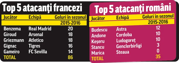 Dacă cei mai buni cinci atacanţi ai Franţei au dat împreună 86 de goluri în 2015-2016, românii sunt la ani-lumină distanţă. Vârfurile cu care vom defila la Euro au strâns 35 de goluri, dar jucând în campionate slabe (România, Bulgaria, Turcia) sau în a doua divizie spaniolă. Mai gravă e situaţia lui Ciprian Marica, proaspătul stelist neavând marcând ultimul său gol acum un an, în februarie 2015.