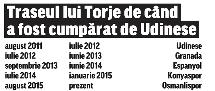 De data aceasta s-a dus la Espanyol. Din septembrie 2013 şi până în iunie 2014 a îmbrăcat tricoul lor şi iar s-a prezentat la Udinese. A luat apoi calea Turciei, fiind dus la Konyaspor, unde a jucat din vara trecută până în ianuarie acest an. „Peninsularii” nu l-au mai lăsat aici şi zilele trecute a fost trimis la Osmanlispor, fosta Ankara, echipă ce a revenit acum în prima ligă turcă. Abia în vara următoare coşmarul lui Torje se va încheia, contractul cu italienii care-l „pasează” dintr-o parte a alta a continentului luând sfârşit. „O nouă echipă! Un nou început!”, a comentat el pe o reţea de socializare, pozându-se alături de sigla actualului club.