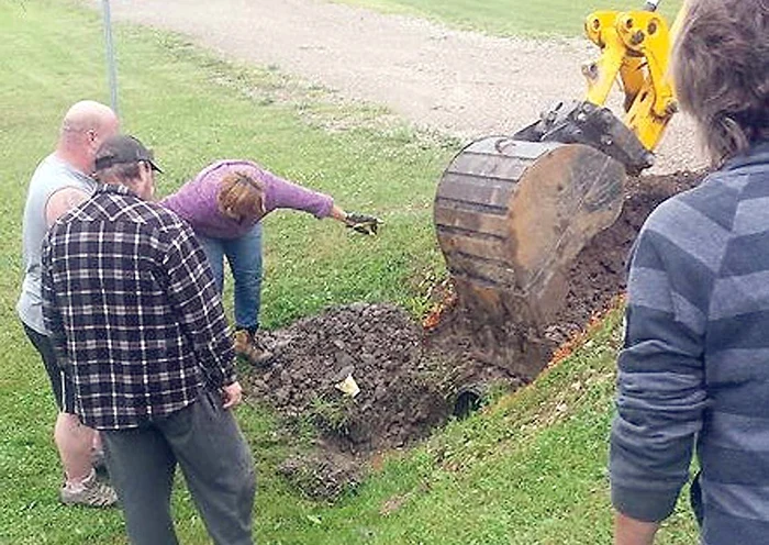 Omul a chemat un buldozer, a săpat în gazon şi apoi a spart drumul până când a reuşit să descopere sursa zgomotelor. Sărmanul dulău căzuse într-un rezervor de scurgere din curte şi apoi a fost aspirat pe conductă. S-a ales cu un picior rupt, dar va supravieţui.