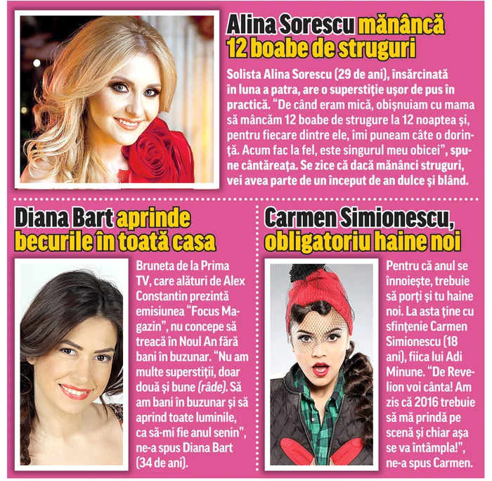 “De Anul Nou port întotdeauna lenjerie intimă roşie”, ne-a spus vedeta. Cântăreţele din trupa Bambi au şi ele aceeaşi superstiţie, dar şi altele, fiecare cu semnificaţia ei. “Trebuie să ai peşte pe masă, ca să înoţi pe lângă necazuri tot anul, un solz de peşte în buzunar, ca să tragă banii la tine, iar când primeşti paharul de şampanie, la 12 noaptea, e bine să pui o monedă în el, pentru prosperitate”, ne explică Raluca (30 de ani) şi Denisa (28 de ani).