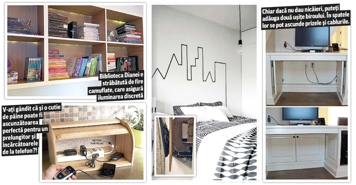 Pasiunea, dar şi studiile pe care le-a făcut au învăţat-o pe Diana Bart să-şi rezolve singură problema cablurilor. Vedeta ne prezintă câteva imagini din propria locuinţă, arătându-ne ce soluţii a găsit. Să luăm spre exemplu televizoarele: metri de cabluri, cu o mulţime de intrări pentru mufe, intrări de internet sau cuplat la laptop. Dacă plasmele sunt agăţate pe un perete, atunci provocarea de a camufla firele devine şi mai mare. „Chiar şi aşa, le-am ascuns de nu se văd. Tot ce înseamnă cablu inestetic a fost tras prin perete sau acoperit cu mobilă. E foarte simplu: am dat două găuri în rigips, sus şi jos, dar şi una în placa de lemn din mobilier, pe unde am tras cablurile până la mufele din spatele televizorului. Iar în partea de jos, prelungitorul l-am băgat în spatele sertarului din mijloc”, explică Diana Bart.
