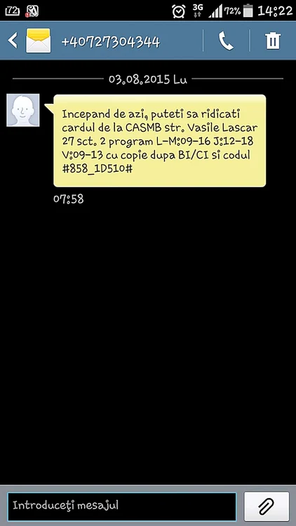 Tot în acest mail ţi se va cere să aştepţi să primeşti un SMS de confirmare privind ridicarea cardului, care va fi trimis în cel mai scurt timp, la ora 08.00 a zilei în care cardul este livrat la sediul CASMB. SMS-ul sună în felul următor: “Începând de azi, puteţi să ridicaţi cardul de la CASMB str. Vasile Lascăr 27, program L-M: 09-15, J: 12-18, V: 09-13, cu copie după BI/CI şi codul #858_1D510# (codul este unic pentru fiecare persoană în parte).