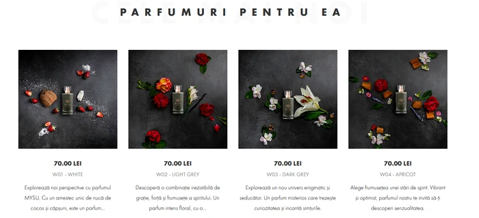 Parfumul este ca o semnătură pe propria piele, de multe ori, o armă a seducţiei, dar şi un potenţator al încrederii de sine, iar parfumurile MYSU doresc să transmită exact acest mesaj misterios în esenţă, dar care pune atât de bine în valoare personalitatea celui care-l alege. Disponibil în două variante, cu ambalaje dedicate publicului căruia i se adresează, MYSU Clasic şi MYSU Luxury, au o abordare enigmatică, seducătoare, plină de magnetism, stârnindu-te să le descoperi vibraţia pe propria piele. În cazul parfumului feminin, aromele sunt florale, iar în cazul celui masculin, aromele sunt cu predilecţie lemnos- orientale.