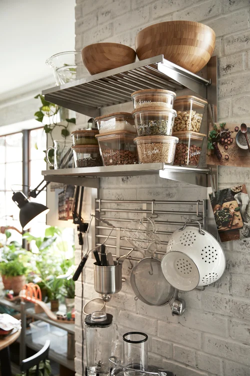 - Instalați polițe în dulapuri, precum cele VARIERA, care creează mai mult spațiu pentru căni și farfurii, dar și pentru alimente neperisabile sau conserve.