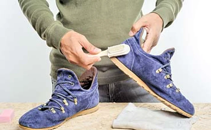 O soluţie de a elimina petele de murdărie este să ştergi încălţările cu un prosop înmuiat în apă şi oţet. Bicarbonatul de sodiu e şi el de ajutor. Se curăţă şi se împrospătează pielea cu o perie înmuiată într-un amestec format dintr-o linguriţă de bicarbonat şi 200 ml de lapte. Trebuie să ştii că în magazine găseşti spray-uri şi gume speciale pentru curăţarea acestui material.