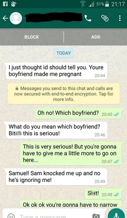 Bărbatul care a lăsat-o însărcinată era deja angajat într-o relație, dar nu a avut nicio rezervă să-și facă de cap cu o altă fată, potrivit Mirror.co.uk. Când însă aceasta a rămas însărcinată cu el, s-a decis să transmită vestea chiar iubitei celui care doar s-a distrat în mod iresponsabil cu ea. I-a transmis vestea pe o rețea de socializare printr-un mesaj privat.