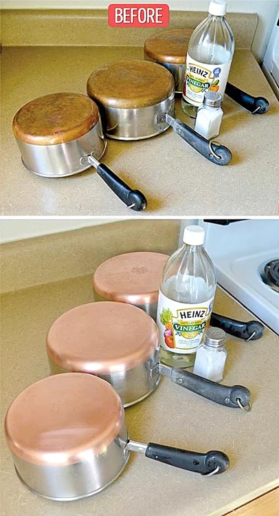 - Vasele de cupru se ard şi se înnegresc în timp. Le „scoţi faţă” curăţându-le cu sare şi oţet. Mai întâi presari sarea pe suprafaţa vizată, apoi stropeşti cu oţetul şi freci bine cu un burete abraziv.
