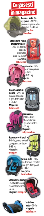 Scaunele auto pentru copii costă între 130-500 de lei, dar unele modele pot depăşi 1.000 de lei. Ele pot fi găsite în magazine, dar pot fi cumpărate şi de pe Internet.