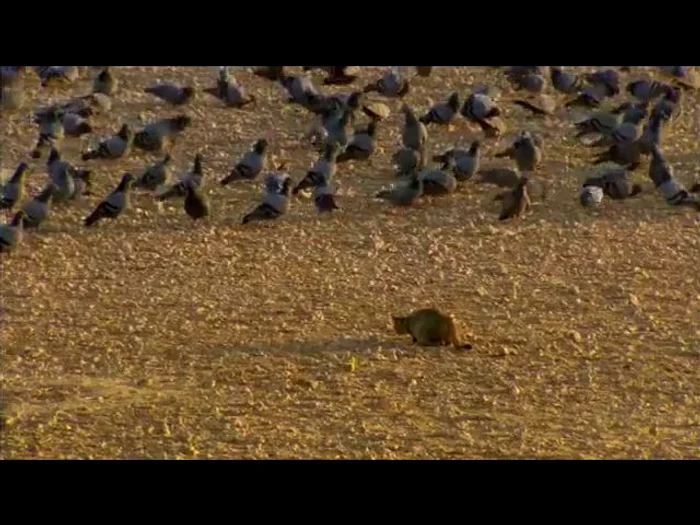 Cu un talent care caracterizează întreaga rasă a felinelor ea îşi urmăreşte victima, se apropie cât mai mult şi nu ratează ocazia de a-şi înfige ghearele şi dinţii în prada multdorită. Pentru că efortul ei a fost răsplătit ea defilează triumfătoare cu porumbelul în gură.