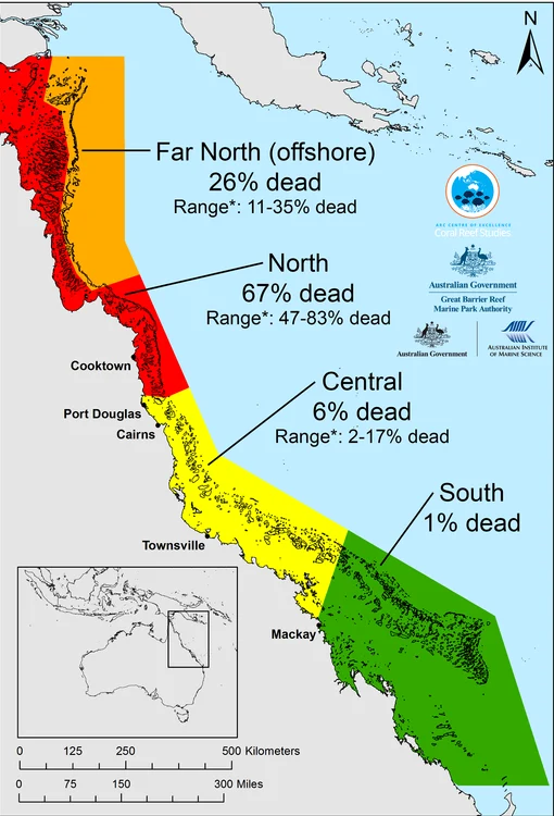 În anii 2016 și 2017, valurile marine au fost extrem de calde din cauza schimbărilor climatice. Rezultatul acestor modificări ale temperaturii la nivelul Globului s-au văzut cel mai bine în Australia: aproape jumătate din coralii din Marea Barieră au murit! El estimează că, între un sfert și o treime din speciile marine depind de ciclul de viață al coralilor sunt vulnerabile din cauza acestor schimbări climatice și ar putea să dispară!