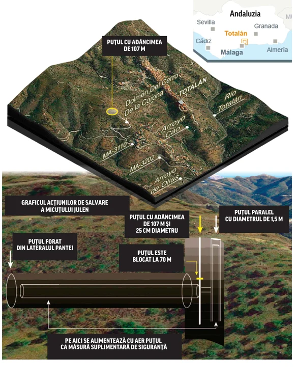 Julen Rosello a căzut duminică, 13 ianuarie, într-un puţ cu diametrul de 25 cm din Totalan, Malaga. Peste 100 de pompieri au demarat o cursă contracronometru de salvare a micuţului. Părinţii acestuia sunt disperaţi. Ei au mai pierdut un copil, de 3 ani, care a făcut infarct.