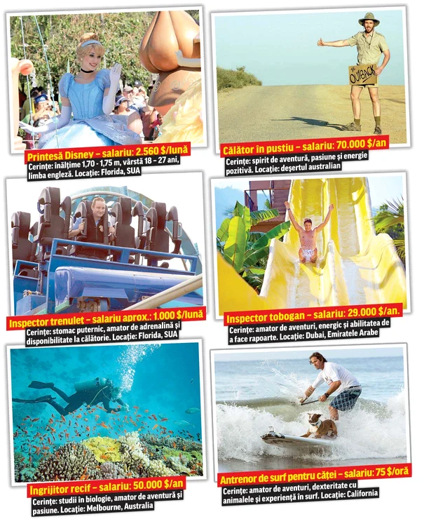 Dacă ai terminat Politehnica şi te-ai plictisit să lucrezi în fabrică, în Florida, SUA, sunt câteva parcuri de distracţii care sunt gata să te angajeze cu 80.000 de dolari pe an, adică 321.320 de lei. Trebuie doar să proiectezi, să verifici şi să testezi trenuleţe montaigne-rousse. Iar dacă nu ai terminat Politehnica poţi alege un alt jobi: inspector de tobogan cu apă. Nu câştigi mai mult de 29.000 de dolari pe an (116.480 lei), dar te dai pe tobogane cât e ziulica de lungă în Dubai, Emiratele Arabe Unite. Singurele cerinţe sunt să-ţi placă adrenalina, să îţi placă să călătoreşti şi să fii în stare să explici ce-ţi place şi ce nu. Iubeşti animalele? Vezi că la Seaworld, din Florida, SUA, focile şi delfinii de-abia aşteaptă un antrenor de sport. Salariul 25.000 de dolari pe an, dar ai masă, casă, asigurări şi diurnă incluse la pachet. Dacă îţi place îngheţata, 60 de mii de dolari pe an, adică 241.000 de lei, te pot convinge să îţi pui papilele gustative la bătaie? Ei bine, în Italia, gelaterii de prestigiu sunt gata să te îndoape pe săturate. Vrei să salvezi planeta, iubeşti scunfundările? Atunci, pentru 50.000 de dolari pe an, avem slujba potrivită pentru tine. E în Australia, la Institutul de Biologie Marină. Scopul tău: să protejezi şi să îngrijeşti coralii. Pentru un plimbăreţ în pustietatea australiană, firmele de turism autohtone pun la bătaie lefuri de 70.000 de dolari pe an, maeştrii elveţieni plătesc un degustător de ciocolată cu 50.000 de dolari pe an şi în însorita Californie, antrenorii de surf pentru căţei încasează 75 de dolari pe ora de bălăceală a patrupedului. Anual, pentru posturile sus menţionate se înscriu peste 45 de milioane de aplicanţi din întreaga lume. Limba engleză este o condiţie, iar norocul, cea de-a doua. Pentru că dacă ai ratat anunţul de angajare publicat în ziarele colorate, nu mai ai nici o şansă.