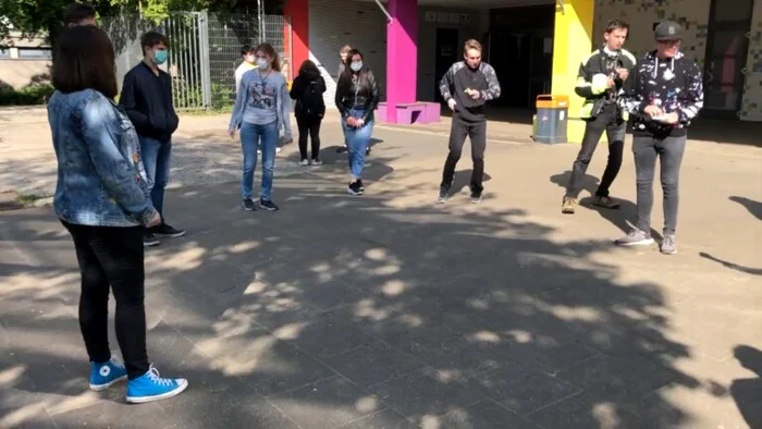 Pasul 3: Toți elevii se adună în curtea școlii, unde există semne pe asfalt pentru menținerea distanței de doi metri unul de altul.