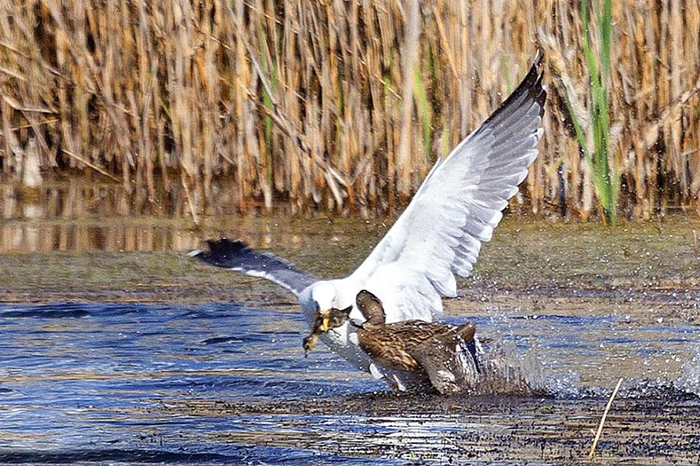 Un pescăruş obraznic din Cambridgeshire, Marea Britanie, a îndrăznit să pună ciocul pe puiul unei raţe care se bălăcea într-un iaz. Supărată la culme, mama-raţă nu a stat prea mult pe gânduri şi a sărit în apărarea puiului, smulgându-i penele de sub aripă pescăruşului hulpav. Ciupitura a fost destul de zdravănă şi zburătorul a scăpat prada din clonţ. Din fericire, răţuşca a supravieţuit atacului.