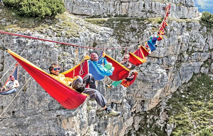 Iubitorii de adrenalină instalează zeci de hamacuri pe nişte frânghii întinse între două culmi muntoase. Apoi ei stau relaxaţi în hamac sau merg pe frânghie, la sute de metri deasupra solului.