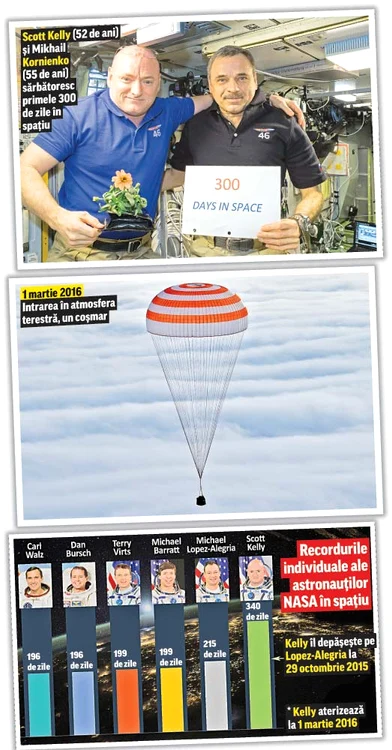 În sfârşit înapoi pe Pământ! Americanul Scott Kelly (52 de ani) şi colegul său rus Mikhail Kornienko (55 de ani) au aterizat marţi, 1 martie, lângă oraşul Dzhezkazgan, Kazahstan, după o misiune de 340 de zile în spaţiu. Cu muşchii atrofiaţi, ei au fost transportaţi înapoi în atmosfera terestră de Serghei Volkov, de 42 de ani, care nu a stat decât 6 luni cu ei în spaţiu.