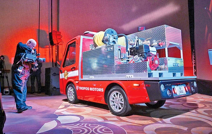 Maşina inteligentă de Pompieri. Panasonic şi Tropos Motors au realizat prima mini-autoutilitară electrică destinată intervenţiilor extreme. Maşina se deplasează cu viteze reduse şi asigură servicii de reperaţie şi întreţinere. Autoutilitara este controlată cu ajutorul unei tablete multifuncţionale Panasonic Toughbook FZ-G1, conectată la GPS.