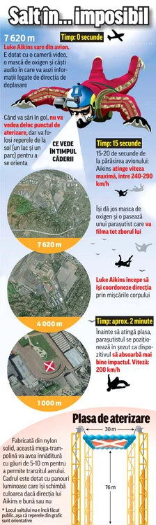 Americanul de 41 de ani e o legendă vie a saltului cu paraşuta şi se antrenează intens lângă Seattle. El vrea să aterizeze pe o trampolină specială de 30 X 30 metri, suspendată la 76 de metri deasupra solului. El va fi ghidat de un dispozitiv GPS conectat la căşti pentru a-şi putea schimba direcţia în caz de nevoie. Specialiştii spun că e suficientă o rafală de vânt neaşteptată şi zborul lui Aikins se va încheia tragic.