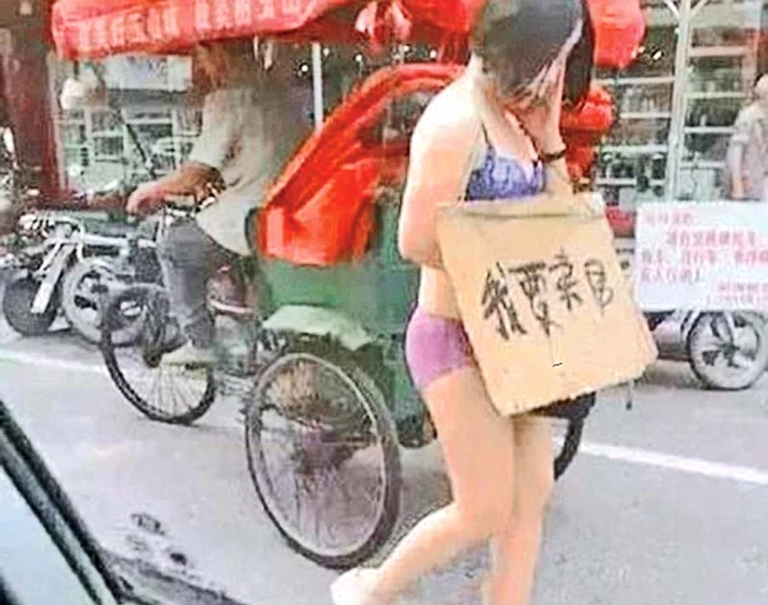 Zhang, de 37 de ani, şi-a bătut măr nevasta, a dezbrăcat-o de haine, apoi a trimis-o la plimbare prin centrul oraşului doar în lenjerie intimă. Wang Ni, în vârstă de 33 de ani, a fost nevoită să meargă pe străzile aglomerate şi cu un carton pe care scria „Vreau să-mi vând trupul”. În tot acest timp, partenerul încornorat o urmărea la tot pasul din maşina sa ca să-i descopere amantul.