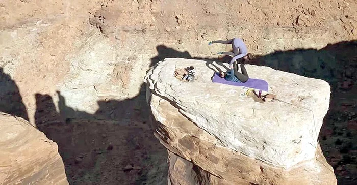 Un cuplu de yoghini americani a dus gimnastica la extrem. Kesley Ondine şi Brian Mosbaugh, amândoi în vârstă de 29 de ani, se relaxează încercând cele mai imposibile poziţii de yoga pe marginea unei prăpăstii din Moab, Utah.