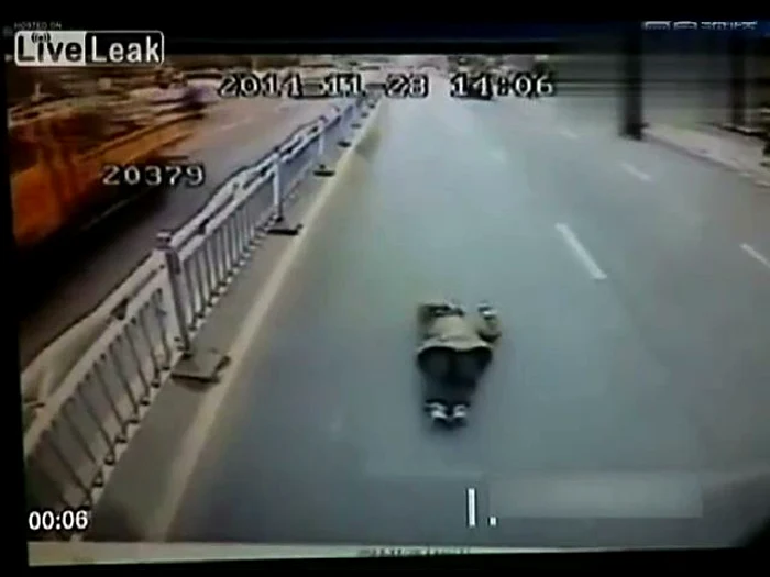 Femeia poate fi observată la marginea drumurului cum aşteaptă vehiculul potrivit şi apoi o ia la fugă pentru a-şi atinge ţelul. Imaginile surprinse de camerele din autobuz ne arată prezenţa de spirit a şoferului dar şi şocul pe care-l suferă pasagerii. Sinucigaşa a ajuns în viaţă la spital, cel care va trebui să dea socoteală fiind şoferul.