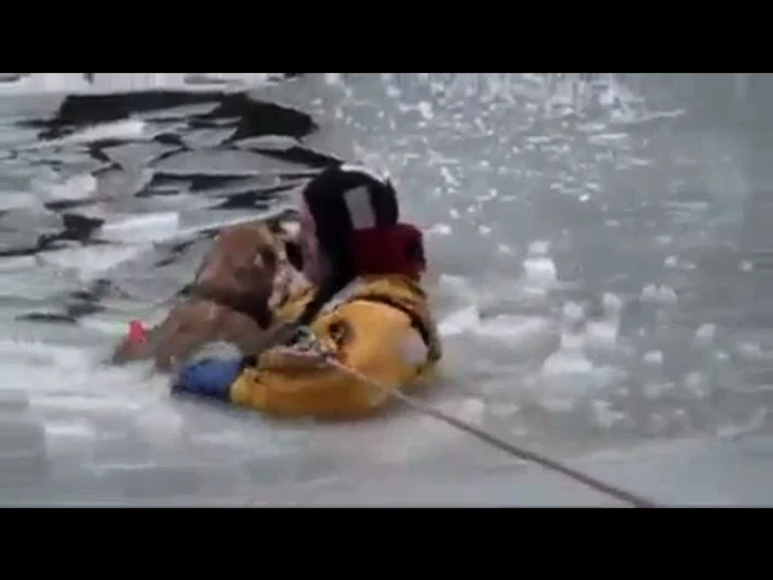 Efortul depus nu este prea mare pentru a salva pe cel mai bun prieten al omului. Salvatorii se aruncă fără ezitare în apa îngheţată pentru a scoate de acolo un câine din rasa golden retriever.