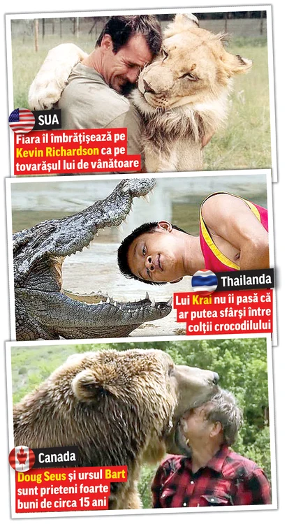Pentru circa 15 dolari pe zi, Krai Thong deschide delicat gura crocodilului şi îşi ţine capul între fălcile acestuia timp de 30 de secunde. Nici canadianul Doug Seus (61 de ani) nu se teme că ar putea muri între colţii ursului grizzly. Bărbatul îşi bagă capul în gura masivă a uriaşului care l-ar putea decapita oricând.