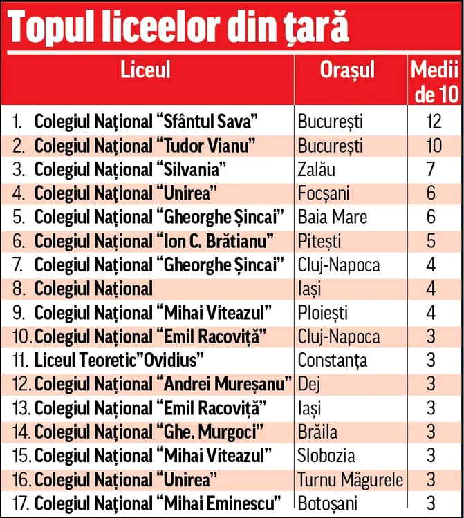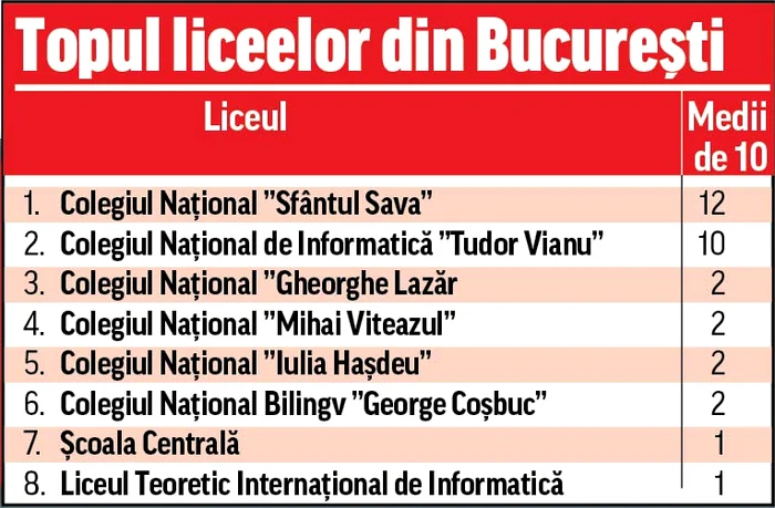 Emoţiile absolvenţilor de liceu au luat sfârşit luni, 8 iulie, când s-au publicat rezultatele preliminare la Bacalaureat. În Capitală, înainte de contestaţii, un singur liceu a avut rată de promovabilitate de 100%, iar 32 de absolvenţi de liceu au luat media 10.00. Colegiul Naţional “Mihai Viteazul” din Bucureşti e singurul din România cu rată de promovabilitate de 100%. Toţi cei 298 de elevi care au susţinut examenul au promovat la toate probele. În plus, doi dintre candidaţi au obţinut media 10.