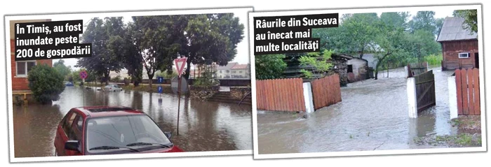 Au fost afectate gospodării din judeţele Bistriţa-Năsăud, Bihor, Covasna, Caraş-Severin, Hunedoara, Maramureş, Mureş, Mehedinţi, Suceava, Sibiu şi Timiş, unde meteorologii au emis ”cod portocaliu” de ploi torenţiale, valabil până în această dimineaţă. Apele au ieşit din matcă, iar viiturile au provocat pagube importante. ”Aşa inundaţii nu am avut din anii ‘70”, a spus Ion SorinTimiş, primarul oraşului Borşa, din Maramureş. Într-o jumătate de oră, au căzut catităţi de apă cât într-o lună. De astăzi, norii se mai risipesc, iar prognozele ANM arată că ploile se vor întoarce la începutul lunii iulie, apoi după 7 iulie.