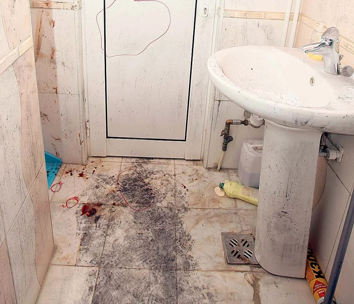 Mobilierul era plin de praf, de la amprentele prelevate, iar în faţa toaletei se întindea o pată imensă de sânge. În toaleta în care a fost înjunghiată apar amprentele victimei, dar şi ale agresorului, pe uşă, pe pereţi, dar şi o zgârietură făcută cu lama cuţitului pe uşa din termopan, ceea ce arată clar că victima s-a luptat să scape din ghearele criminalului. Cele 10 lovituri de cuţit i-au fost fatale Loredanei, iar sângele a ţâşnit peste tot prin baia de serviciu. ”Nu mai pot să intru aici niciodată. Şi eu am fost în pericol, el m-a ameninţat de foarte multe ori pentru că o protejam pe Loredana. În dimineaţa respectivă, la 8.30 mai precis, trebuia să fiu aici.
