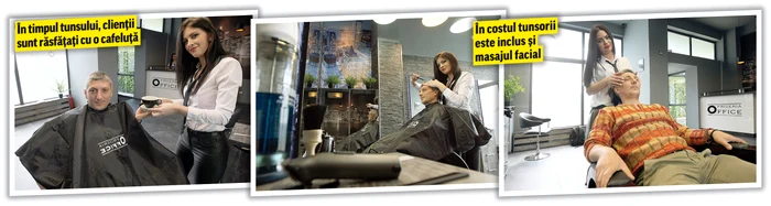 Ne-am lăsat şi noi pe mâinile celor trei frumoase şi nu ne-a părut rău. Pentru 57 de lei, ai parte de un huzur cum nici n-ai visat. Pe lângă tunsoarea ultimul răcnet, tinerele domniţe, îmbrăcate office, provocator, îţi oferă, bonus, un masaj relaxant, în timp ce îţi savurezi cafeluţa. Dacă podoaba capilară v-a „părăsit”, nu-i bai: fetele sunt gata să vă penseze sprâncenele, să vă netezească barba sau să vă facă manichiura. Nici un bărbat nu pleacă nerezolvat, odată ce a intrat pe mâna sexy-frizeriţelor.