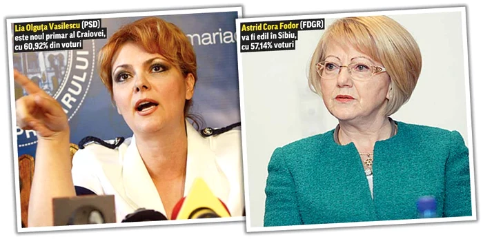 Lia Olguţa Vasilescu (41 ani) a câştigat un nou mandat de primăriţă la Craiova, deşi procurorii DNA o acuză de fapte de corupţie. Pasionată de politică, Olguţa a devenit membru fondator al Partidului România Mare în anul 1991, pe când avea 17 ani. În 2007, a devenit membru şi senator PSD. La alegerile din noiembrie 2012, a câştigat fotoliul de edil al oraşului Craiova cu 45,6%, iar acum a câştigat încă un mandat cu voturile a 60,92% din alegători. Puţini ştiu că roşcata este absolventa Facultăţii de Litere şi Istorie, iar de la 23 de ani a lucrat ca jurnalist, timp de 4 ani. Olguţa Vasilescu s-a apucat de karate în anul 1986 şi este specializată în stilul japonez Shotokan-Fudokan, unde deţine centura neagră 2 Dani. Este născută în ziua de 18 noiembrie, în zodia Scorpion, nativi despre care astrologii spun că sunt maeştri ai auto-controlului, calmi, stăpâni pe ei şi le place să se afle la conducere.Astrid Cora Fodor (62 ani) este noul primar al oraşului Sibiu, mandat câştigat cu 57,14% din voturi, la mare distanţă de al doilea clasat. Aceasta este şi acum primar interimar al oraşului, din 2014, după ce Klaus Iohannis a ajuns preşedinte. Şi ea face parte din Forumul Democrat al Germanilor din Romania (FDGR), ca şi fostul edil al oraşului. Este absolventă a Facultăţii de Drept administrativ şi, până să intre în politică, a lucrat ca jurist la Mediaş, apoi economist şi director economic la Consistoriul Evanghelic, la Sibiu. Este necăsătorită şi are doi copii. Este născută pe 6 noiembrie, zodia Scorpion, despre care astrologii spun că nativii sunt siguri pe sine, stăpâni pe cunoştinţe tehnice, încrezători în abilităţile lor şi în şansele de reuşită.