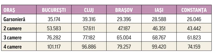 Explicaţia? “Situaţia poate fi pusă pe seama exodului populaţiei din zona Clujului în oraş, după ce companiile de IT s-au orientat către Cluj-Napoca. Acest lucru, coroborat cu numărul relativ mic de proiecte rezidenţiale noi din Cluj, a creat o cerere mai mare decât oferta, iar proprietarii au speculat această conjunctură, mărind preţurile în conformitate cu realitatea din piaţă”, explică specialiştii Imobiliare.Net. Doar în cazul apartamentelor cu 4 camere Bucureştiul conduce topul celor mai scumpe oraşe ale ţării. Aici, o astfel de locuinţă se poate cumpăra, în medie, cu 101.117 de euro. Braşovul şi Iaşul au preţuri de mijloc, în timp ce la Constanţa se găsesc cele mai ieftine apartamente: 26.046 de euro o garsonieră, 43.442 de euro 2 camere, 61.823 de euro 3 camere şi 74.159 de euro 4 camere.