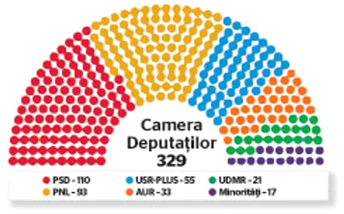După repartizarea mandatelor, din totalul de 329 de aleşi pentru Camera Deputaţilor, PSD are 110 parlamentari, în timp ce PNL, principala forţă a viitoarei guvernări, strânge 93 de deputaţi. USR-PLUS obţine 55 de deputaţi, în timp ce surpriza acestor alegeri, Alianţa pentru Unirea Românilor (AUR), dă 33 de aleşi în Cameră.