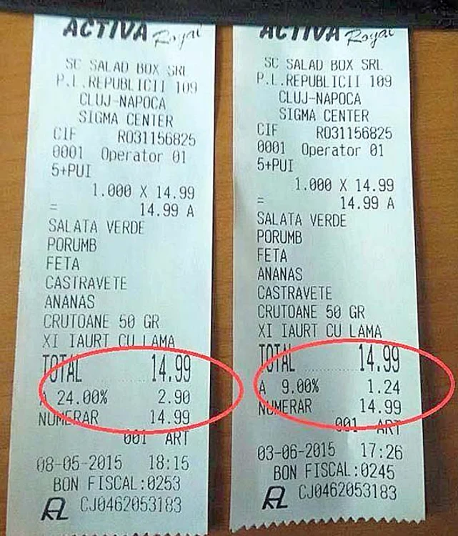 Primul bon este din 8 mai, când TVA la alimente era 24%, iar cel de-al doilea este din 3 iunie, la trei zile după ce taxa pe valoare adăugată a coborât la 9%. Europarlamentarul a cumpărat exact aceleași produse, în aceeași cantitate. Surpriză: au avut aceleaşi preţuri.