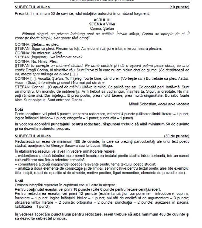 Absolvenții de liceu care au absolvit un profil real au avut de redactat la subiectul al III-lea de la proba la Limba și Literatura Română un eseu în care să comenteze o operă scrisă de George Bacovia sau Lucian Blaga, la alegere.