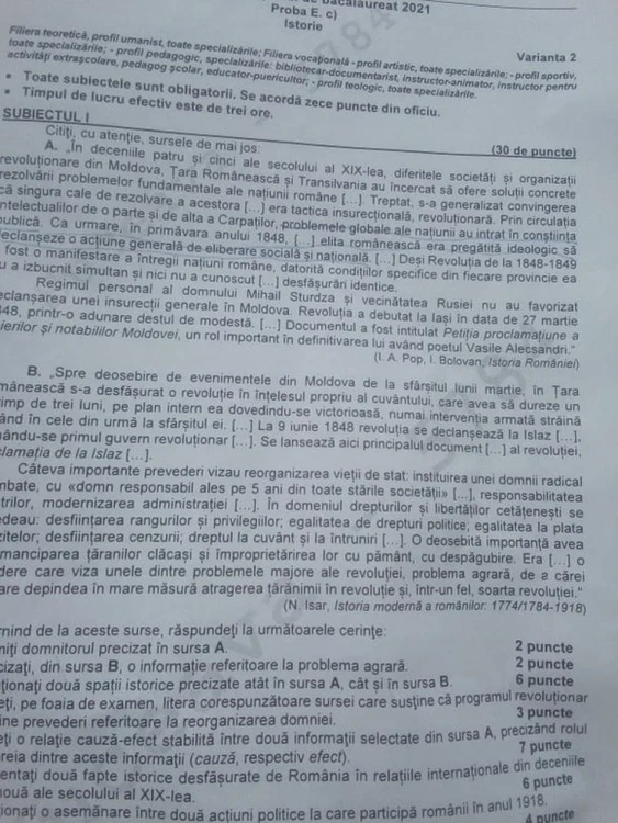 Examenul de Bacalaureat 2021 continuă marți, 29 iunie, cu proba obligatorie a profilului. Elevii absolvenți de liceu au susținut examen la Matematică și Istorie. Iată subiectele la Istorie!
