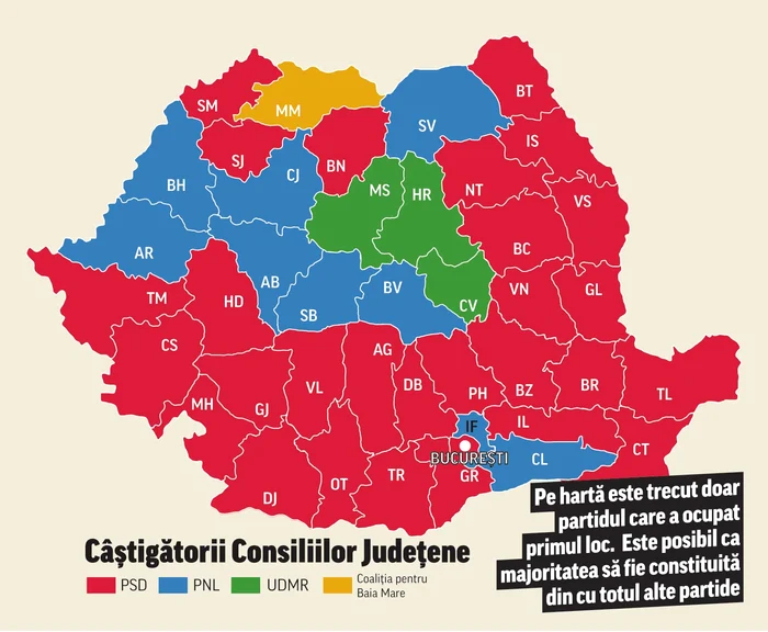 Liberalii şi-au făcut-o cu mâna lor, cel puţin la nivelul Consiliilor Judeţene. Deşi au susţinut alegerea preşedinţilor de CJ-uri indirect, prin votul consilierilor, liberalii sunt puternic dezavantajaţi de acest sistem, urmând să formeze majorităţi în puţine judeţe. Anunţul lui Liviu Dragnea, potrivit căruia PSD, UNPR şi ALDE se vor alia peste tot unde este posibil, face lucrurile clare în privinţa consiliilor judeţene. UDMR a obţinut majoritate absolută în Harghita şi Covasna, dar şi o majoritate simplă în Mureş, unde poate emite astfel pretenţii pentru şefia consiliului judeţean, cel mai probabil într-o majoritate cu PNL. Configuraţia finală a majorităţilor din consiliile judeţene poate să fie puţin diferită, în funcţie de redistribuirea procentelor şi de înţelegeri de ultim moment între partide.