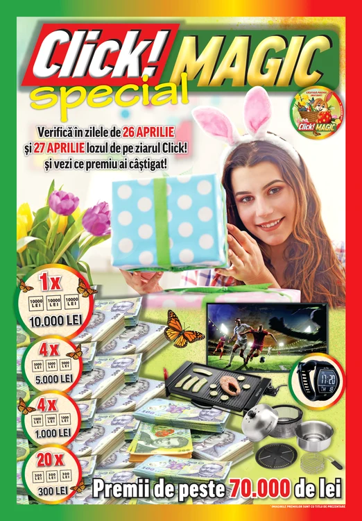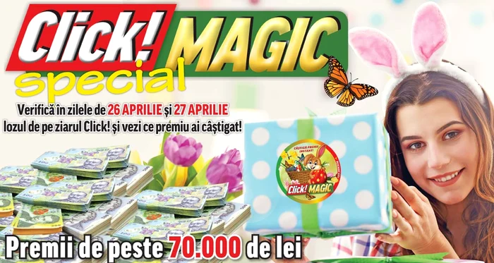 Vineri, 26 aprilie și sâmbătă, 27 aprilie ți-am pregătit o ediție specială a concursului Click!MAGIC în care poți câștiga unul dintre cele 750 de premii-cadou: BANI CASH, GADGETURI, ELECTRONICE, ELECTROCASNICE și multe alte premii.