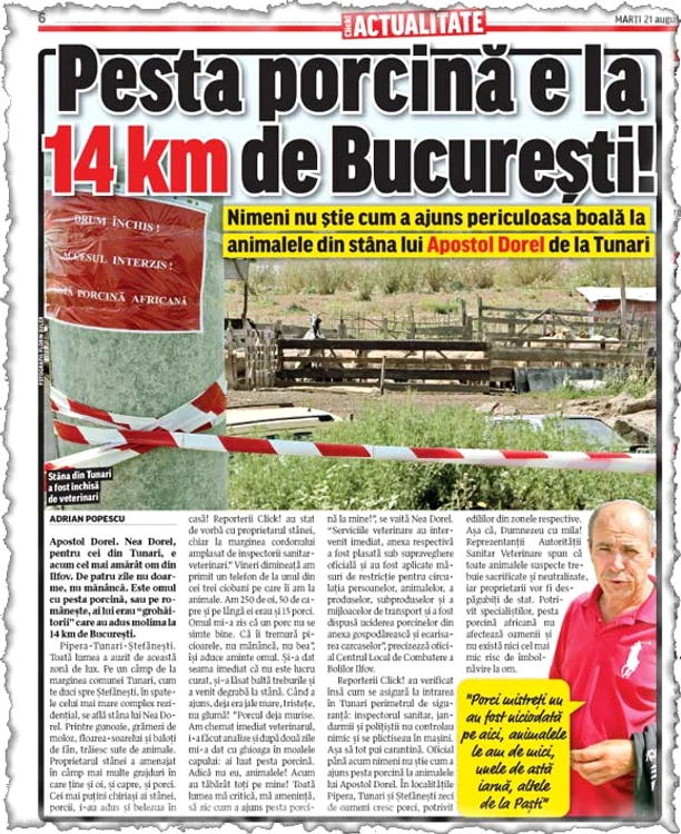 Pe un câmp de la marginea comunei Tunari, cum te duci spre Ştefăneşti, în spatele celui mai mare complex rezidenţial din Ilfov se află stâna lui Dorel Apostol. Acolo, la 14 kilometri de Bucureşti, omul creştea, până să i se întâmple necazul, 300 de oi, 50 de capre şi 15 porci. Când a auzit de pesta porcină de la Satu-Mare a râs, când a citit de pesta porcină de la Buzău s-a minunat, iar când a văzut la televizor cazuri de pestă porcină prin Deltă a dat a lehamite din mână.