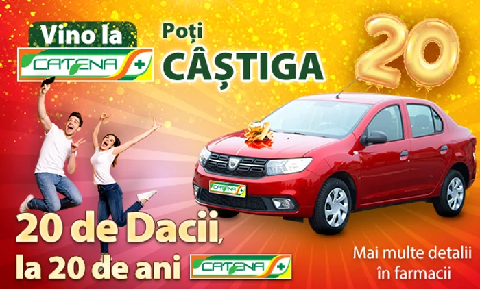 Nu uitaţi, până pe 20 decembrie 2019 aveţi şansa de a intra în marea competiţie „20 de Dacii, la 20 de ani de Catena”. Trebuie doar să cumpăraţi din orice farmacie Catena produse în valoare de minimum 30 de lei (conform bonului fiscal) şi să completaţi talonul de participare la campanie. Ulterior, depuneţi taloanele completate în urnele existente în farmaciile Catena. Mai multe detalii puteţi afla în farmaciile Catena.